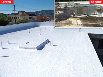 Our SPF System is a great way to provide high-grade insulation on both roofing and interior wall applications, for top-down protection from the elements. An SPF application effectively controls air filtration, adds building strength and reduces cooling and heating costs. During the restoration process each problem area is systematically addressed, repaired and resealed; then the entire roof is sealed with a reflective finish coat.